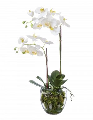 Орхидея Фаленопсис белая куст 60 см 2 ветви в стекл.вазе с мхом, корнями, землёй 1/1 10.0611066WHGL60