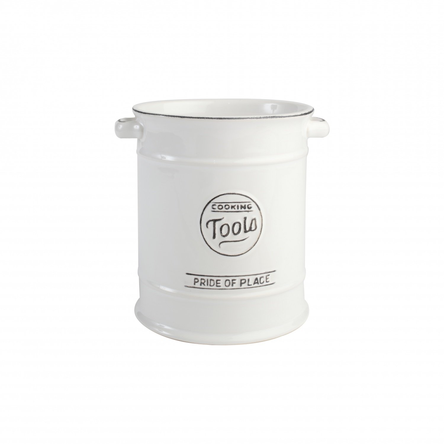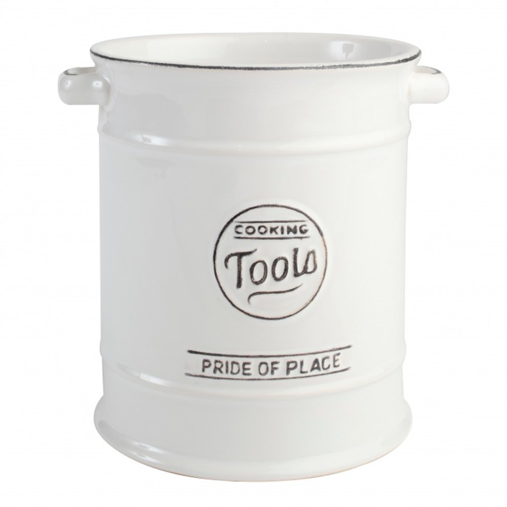 Белая керамическая ёмкость в виде бака с ручками без крышки для хранения кухонных принадлежностей, выполненная в эстетике винтажной эмалированной посуды, с «потертостями» цвета темного железа.
