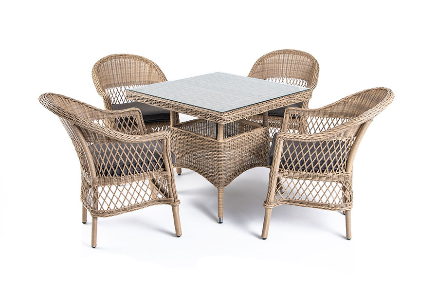Обеденная группа из искусственного ротанга: 4 обеденных кресла и обеденный стол со стеклянной столешницей. Алюминиевый каркас, круглый искусственный ротанг соломенного цвета, ручное плетение. Кресла оснащены подушками со съемными чехлами. "Айриш" стол плетеный из искусственного ротанга, цвет соломенный 1шт. 900Х900Х750, "Сицилия" плетеный стул из искусственного ротанга, цвет соломенный 4шт. 590Х640Х820,