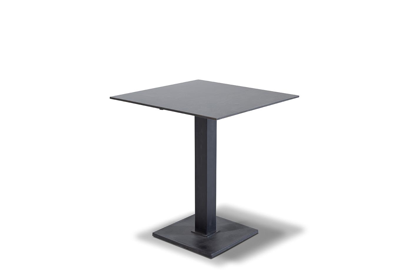 Квадратный интерьерный стол «Каффе» для двоих персон. Столешница выполнена из современного полимерного компакт-пластиком HPL, толщиной 12 мм, в цвете «cерый гранит». Этот материал устойчив к высоким температурам (можно ставить горячую посуду), пролитой жидкости, не требует специального ухода. Подстолье изготовлено из чугуна, благодаря чему столик очень устойчив на любых поверхностях.