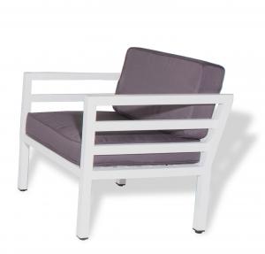 Металлическое кресло «Глория» для обустройства лаунж-зоны. Каркас изделия изготовлен из прочного, но легкого алюминия белого цвета. На сидении и спинке плоские подушки с серыми съемными чехлами, которые можно стирать в стиральной машине с использованием специальных средств.