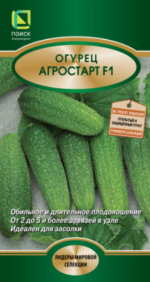 Огурец «Агростарт F1» — это раннеспелый, высокоурожайный партенокарпический гибрид (40-45 дней) от агрофирмы, универсальный для открытого и защищенного грунта. Формирует пучковые завязи (2-5 шт. в узле), плоды темно-зеленые, бугорчатые, длиной 10-15 см, отличаются отличным вкусом без горечи. Подходит для свежего потребления и консервации.