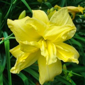 Рассада лилейника Дабл Ривэ Вай (Double River Wye) удивительный сорт, для которого характерно обильное цветение. В этот период на нем формируются махровые цветки лимонно-желтого оттенка. Растение относится к разновидностям дневного типа цветения. Бутоны на нем распускаются в конце июля и радуют взор окружающих в течение 2 месяцев своими нежными яркими цветками. В диаметре их размер составляет 13 см. Лилейник способен хорошо зимовать независимо от региона. Для укрытия используется невысокий слой мульчирования. Остальную защиту корням и стеблям предоставляет снежный покров.